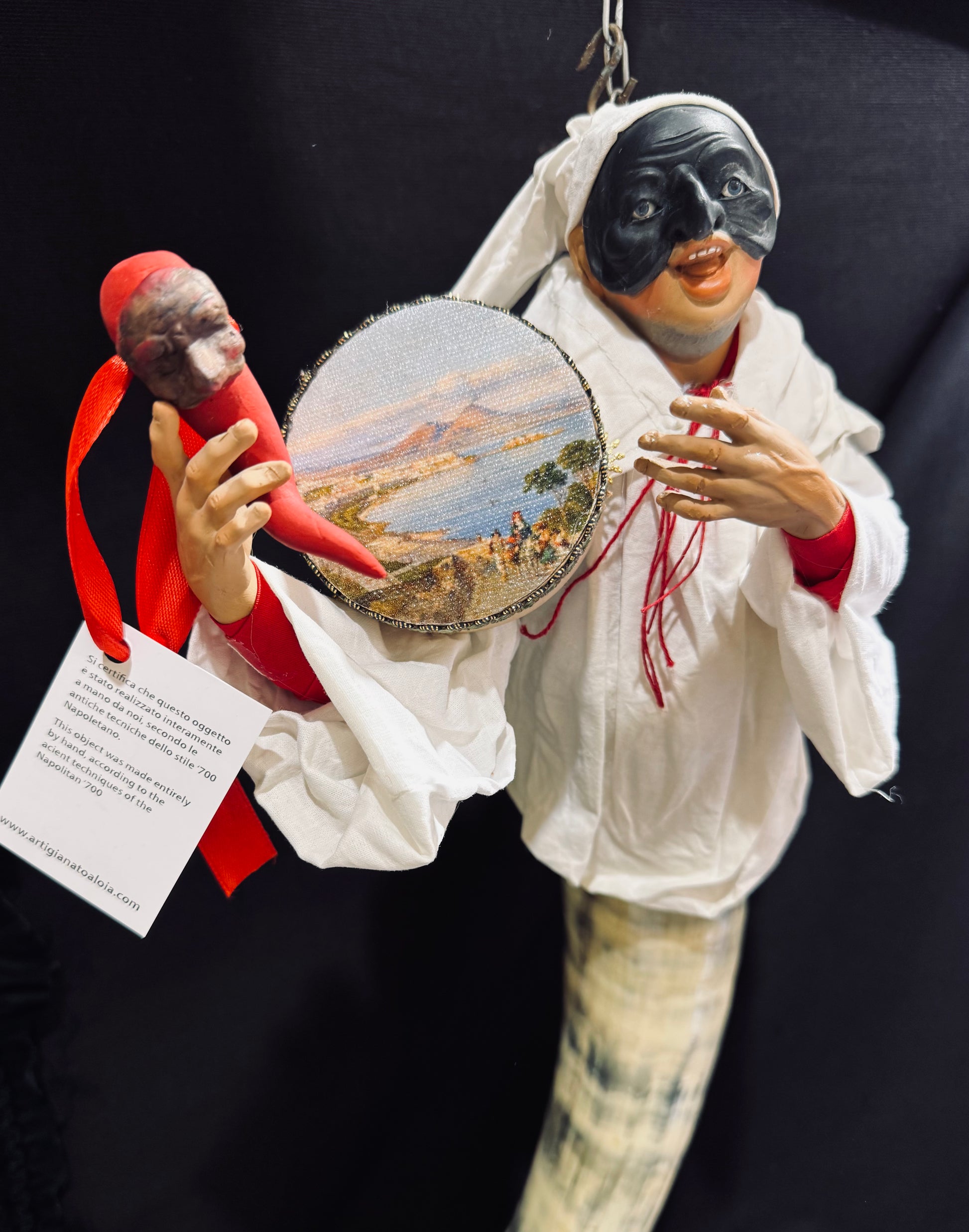 Pulcinella fatto a mano, con testa e mani in terracotta, occhi in vetro e vero corno naturale.