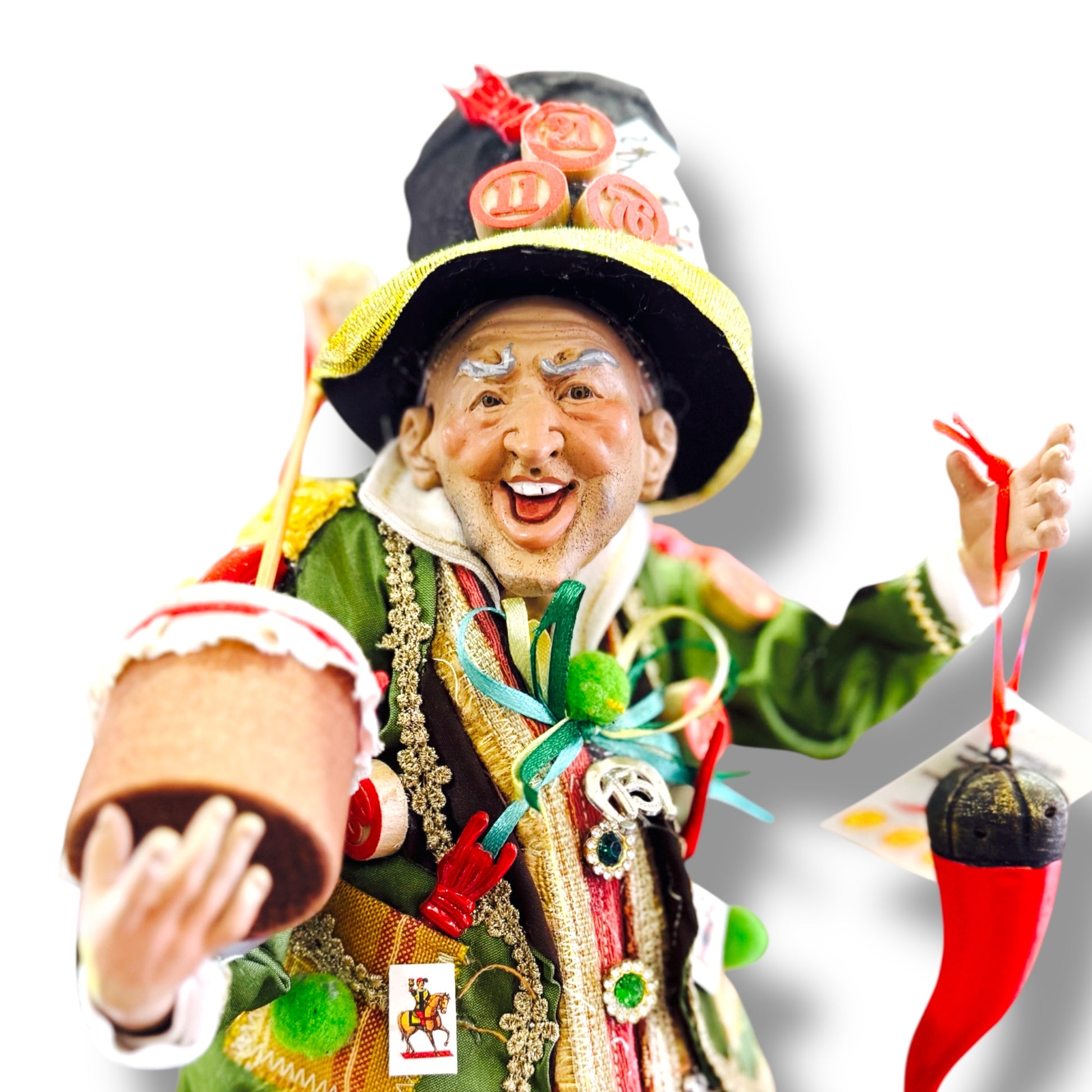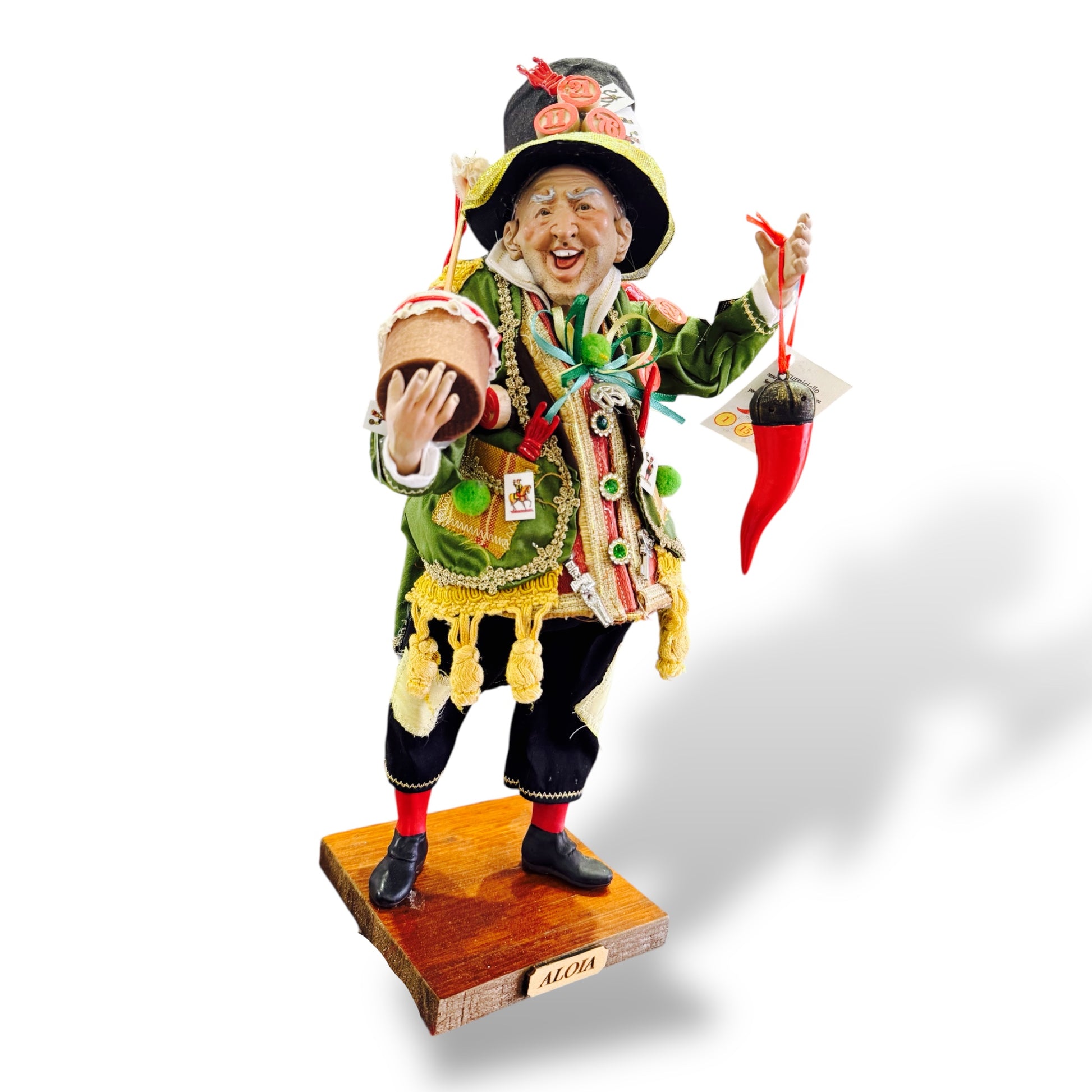 Lo Sciò Sciò è una figura fortemente radicata nella cultura scaramantica napoletana: è un simbolo di buona sorte e protezione. Il suo volto buffo, la gobba e gli amuleti appesi ai vestiti (come coni e ferri di cavallo) sono tutti elementi carichi di significato, pensati per scacciare il malocchio e le negatività. Questa statuina non nasce nel presepe, ma si radica nella tradizione popolare come portatore di auspici e prosperità.